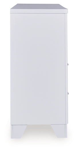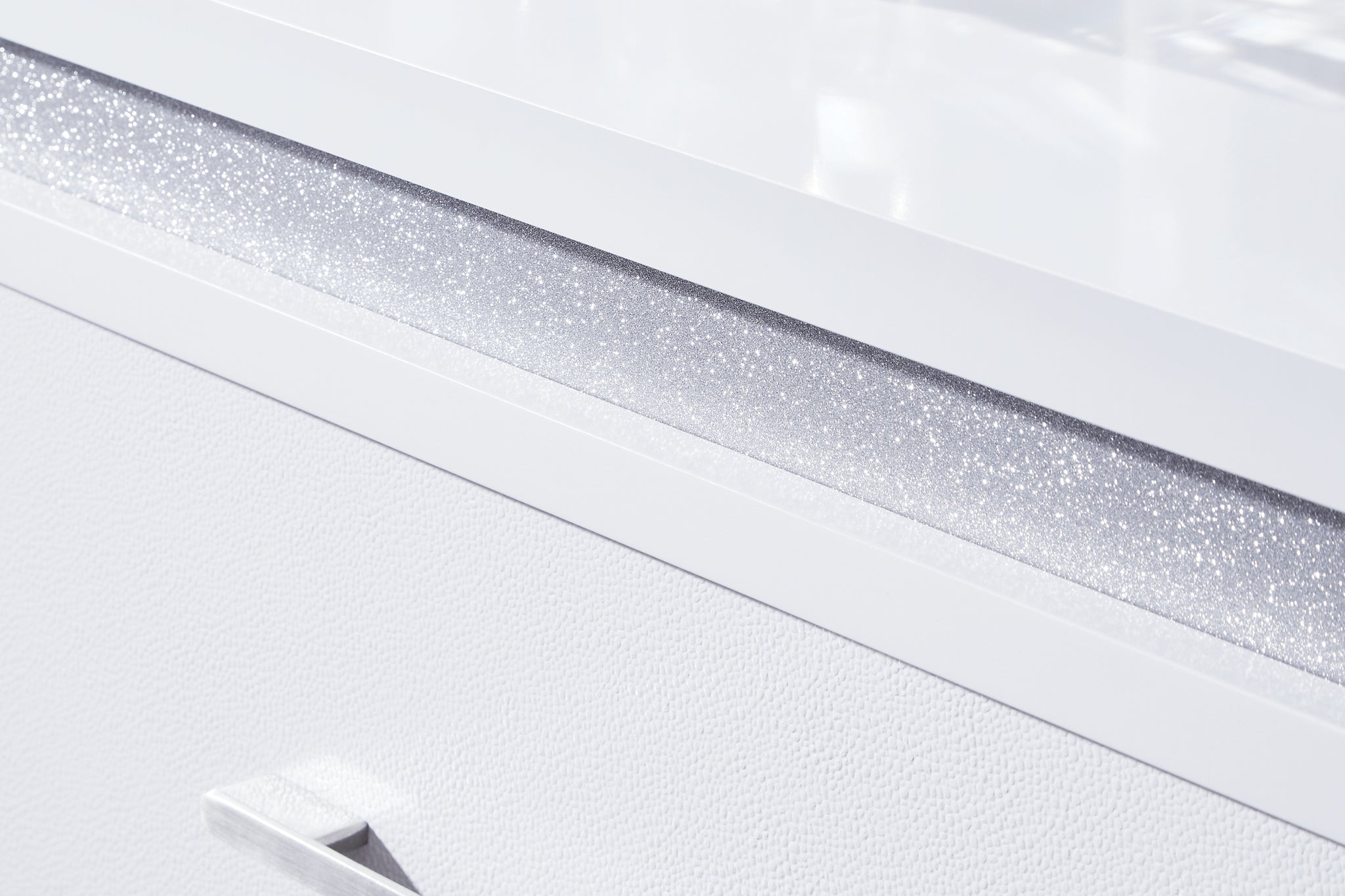 Made with hardwood solids and MDF substrates, White paint finish, Inset acrylic glitter accents, Horizontal metal drawer pulls, 6 drawers with fully finished interiors, dovetail construction and heavy duty ball-bearing side glides, Textured drawer fronts |