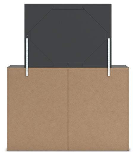 Includes dresser and mirror, Made with engineered wood (MDF/particleboard/plywood) and decorative laminate for the right balance of affordability and durability , Dark charcoal finish over replicated oak grain, Decorative laminate replicates natural or man-made material surfaces with consistent color, pattern and texture, Recessed hand grabs create hardware-less effect, 6 smooth-gliding drawers, Drawer interiors are lined with a faux linen laminate for a clean, finished look , Safety is a top priority, clothing storage units are designed to meet the most current standard for stability, ASTM F 2057 (ASTM International), Drawers extend out to accommodate maximum access to drawer interior while maintaining safety, Mirror attaches to back of dresser; can also be mounted on wall horizontally or vertically, Assembly required |