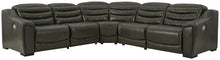 Includes 5 pieces: left-arm facing power recliner, armless chair, power armless recliner, wedge and right-arm facing power recliner, "Left-arm" and "right-arm" describe the position of the arm when you face the piece, One-touch power control with adjustable positions, Easy View™ adjustable headrest and zero-draw USB port, Zero-draw technology only consumes power when the USB receptacle is in use, Corner-blocked frame with metal reinforced seat, Attached cushions, High-quality foam cushions wrapped in poly fiber, 100% top grain leather covers inside areas such as the back, seat and arm cushions; skillfully matched faux leather covers the remaining areas, Due to its natural origin, real leather can show individual characteristics such as healed scars, growth marks, grain variation and shade variation, Natural variations make each hide unique and do not detract from the wearing qualities of leather, Zero wall recliner design requires minimal space between wall and chair back, Power cord included; UL Listed |