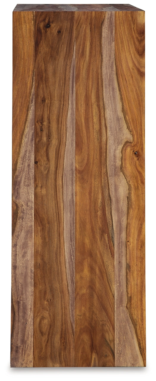 Made with sheesham wood, veneer and MDF substrate, Clear natural wood-tone finish, Front frame with thick beveled edge, 5 smooth-gliding drawers with fully finished interior, dovetail construction and heavy duty ball-bearing side glides |
