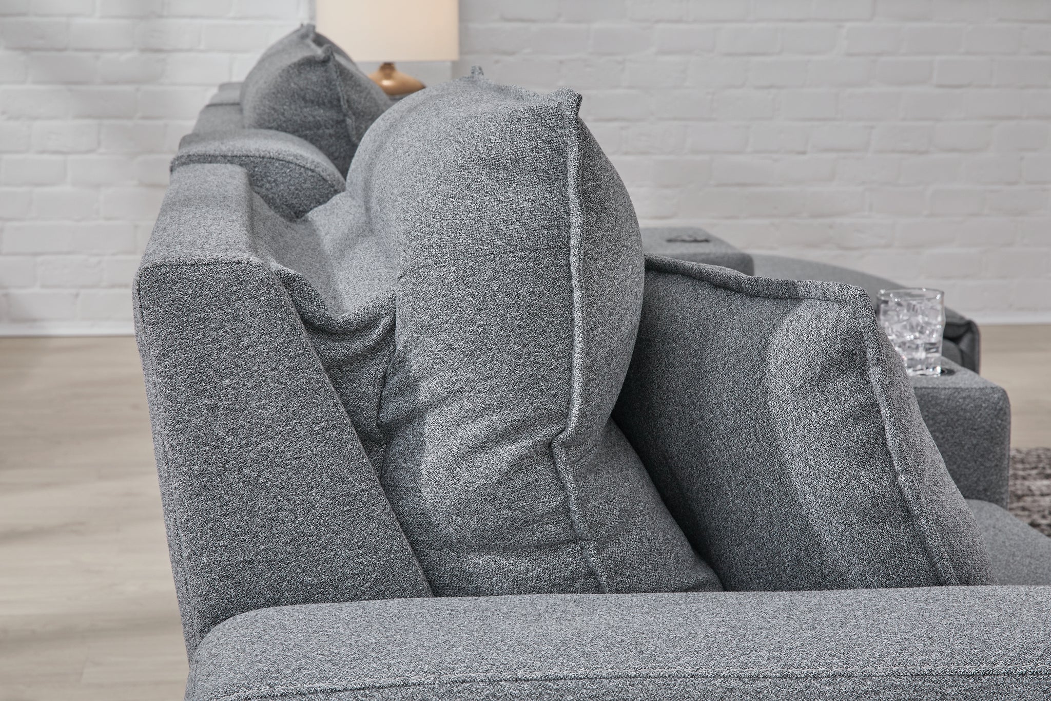 Includes 6 modular pieces: left-arm facing power recliner, power armless recliner, armless chair, console, wedge and right-arm facing power recliner, "Left-arm" and "right-arm" describe the position of the arm when you face the piece, Versatile modular pieces fit together in a variety of configurations, One-touch power control with adjustable positions, Easy View™ adjustable headrest and zero-draw USB port, Zero-draw technology only consumes power when the USB receptacle is in use, Corner-blocked frame with metal reinforced seat, Attached seat and back cushions; high-quality foam cushions wrapped in poly fiber, Polyester upholstery; Next-Gen Nuvella™ is a family-friendly fabric that is soft, easy to clean, stain-resistant and durable, Clean fabric with mild soap and water, let air dry; for stubborn stains, use a solution of 4 oz. bleach to 28 oz. water, Throw pillows with easy-to-remove zippered covers for machine washing; pillows with soft polyfill, Console with plexiglass top and 2 cup holders, Zero wall recliner design requires minimal space between wall and chair back, Power cord included; UL Listed |