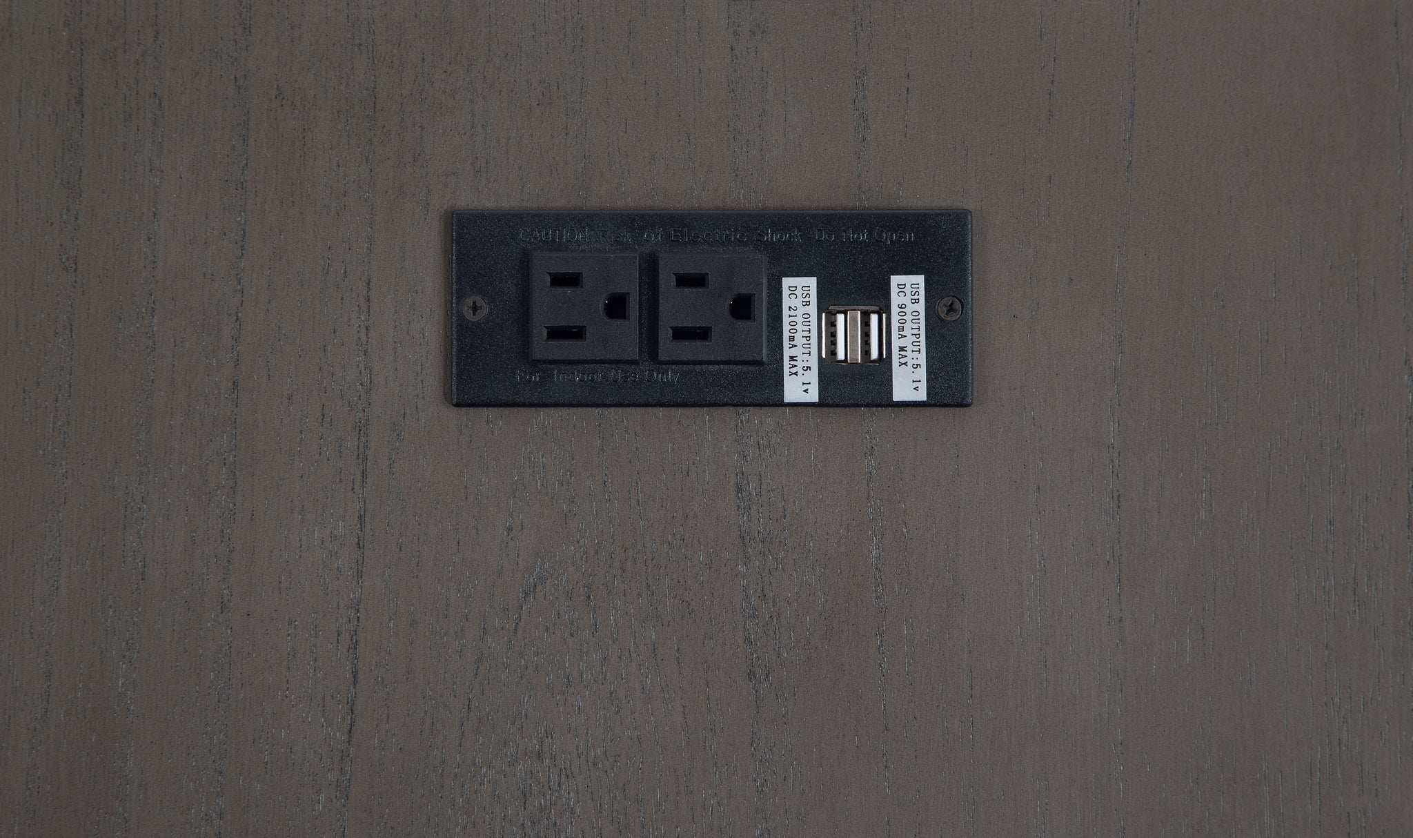 Made with solid wood, wood veneer and MDF substrate, Gray wood tone finish, Table features storage cabinet, open cubby shelf and pull-out tray, 110V power supply with dual USB charging ports, Power cord included; UL Listed, Due to the use of natural materials, some variations may occur, Assembly required |