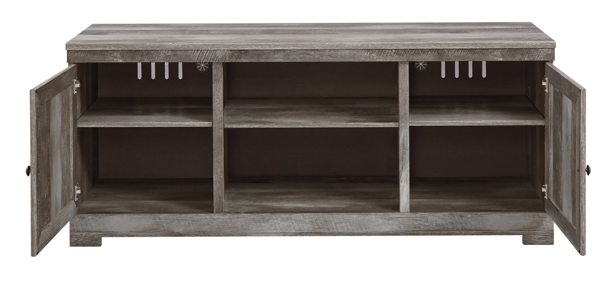 Includes TV stand and electric fireplace insert (W100-02), Made with engineered wood (MDF/particleboard), Rustic gray finish over replicated oak grain, Plank effect, 2 storage cabinets (each with an adjustable shelf), Removable/adjustable center shelf, Cutouts for wire management and ventilation, Electric fireplace insert provides up to 4,608 BTU/1,400W and warms up to 400 square feet (heats a mid-size room) , 6-level temperature setting; 5 levels of flame brightness; overheating control device, LED-lit flame operates with or without heat; option for placing faux glass crystals or stones (included), Remote control with LED display, Power cord included; UL Listed, Assembly required; simply remove the center shelf and back panel to make room for the fireplace insert |