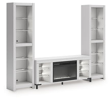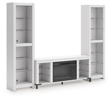 Includes TV stand with electric fireplace and 2 piers, Made with engineered wood (MDF/particleboard/plywood) and decorative laminate for the right balance of affordability and durability, Matte white finish with subtle replicated wood grain, Decorative laminate replicates natural or man-made material surfaces with consistent color, pattern and texture, Legs with black finish, TV stand with 4 backlit glass shelves, Pier with 4 backlit glass and single engineered wood shelves , Fireplace insert and backlit shelves feature color and brightness controlled LED lighting, 3 color settings for synchronized LED lights: blue, red and white, Remote control with LED display, Power cord included; UL Listed, Minor assembly required |