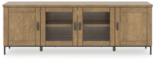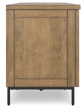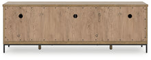 Made with solid wood frame, birch veneer, MDF substrate and steel, Clean medium brown wood finish, Tubular steel legs with matte black powder coat finish, 2 outside cabinets, each with an adjustable shelf for concealed storage, Center cabinet with inset glass doors and 2 adjustable shelves, Cutouts for cord management, Assembly required |