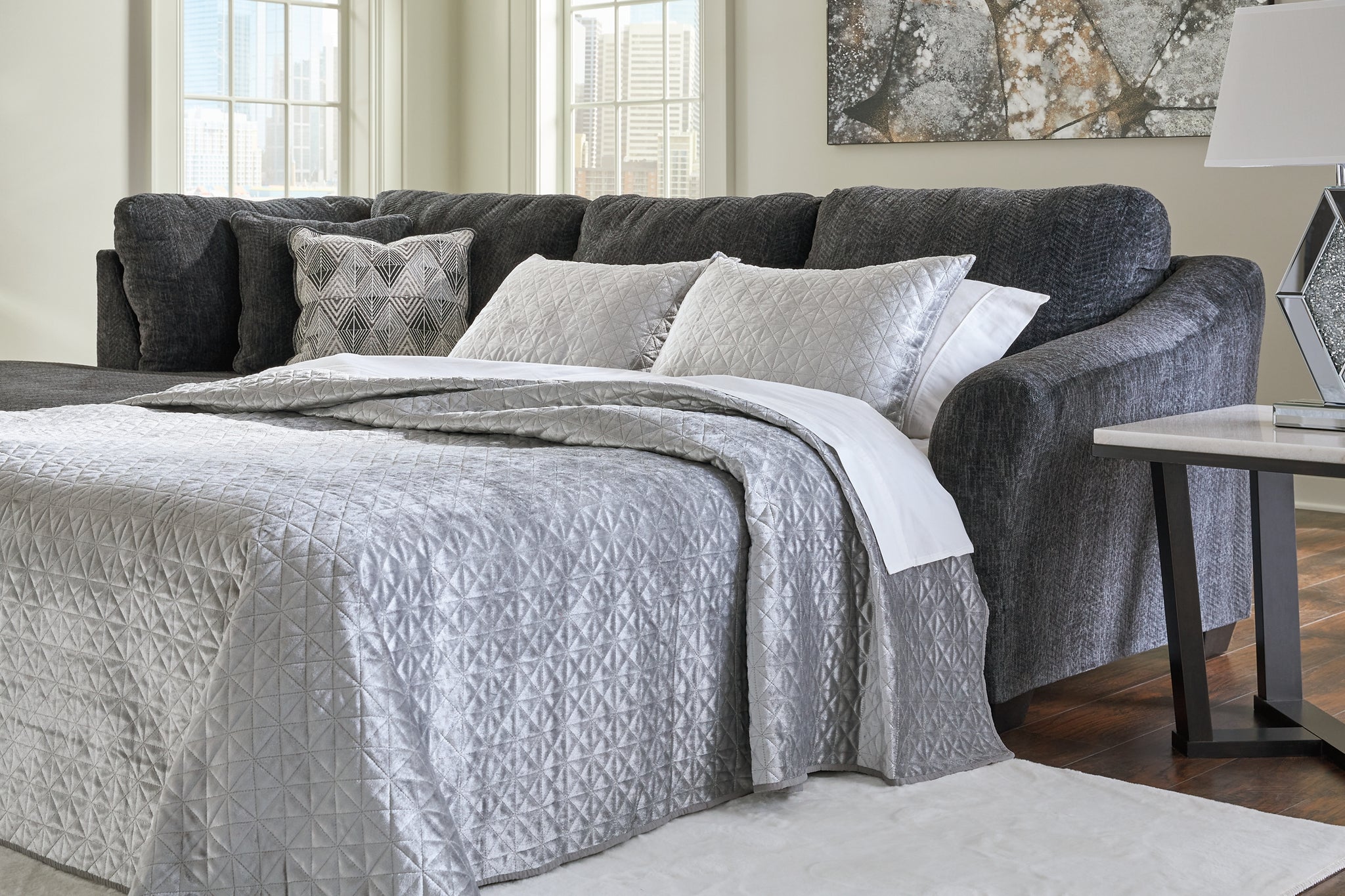 Bring fashionable function to the forefront with this sleeper sectional with chaise. A transitional arm design adds flair to the frame, incorporating subtle visual interest into the otherwise clean-lined silhouette. Dress it up or down. In a richly versatile neutral, this sectional appeals to a variety of style personalities. An included pull-out mattress easily accommodates overnight guests.