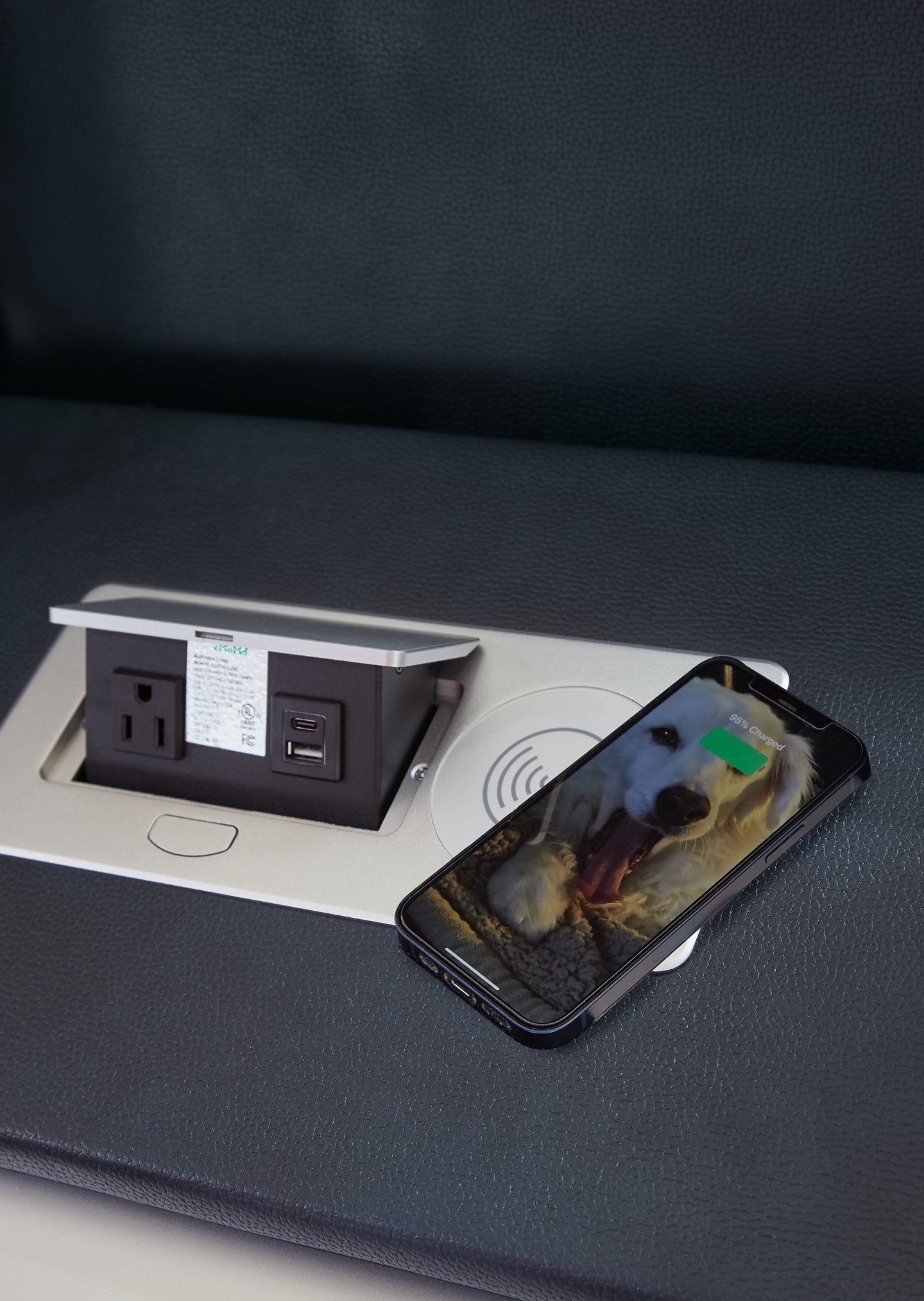 One-touch power control with adjustable positions, Easy View™ adjustable headrest and zero-draw USB port, Zero-draw technology only consumes power when the USB receptacle is in use, Corner-blocked frame with metal reinforced seat, Attached cushions, High-quality foam cushions wrapped in poly fiber, Faux leather upholstery, Ambient blue LED lighting on base for a theater-style experience, Armrests with flip-top storage and cup holder, Drop-down table with LED reading lights, dual cup holders, electrical outlet, USB charging port and wireless charging, Power cord included; UL Listed |