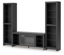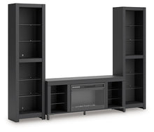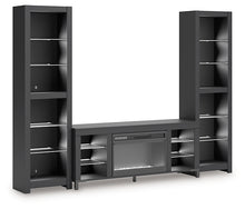 Includes TV stand with electric fireplace and 2 piers, Made with engineered wood (MDF/particleboard/plywood) and decorative laminate for the right balance of affordability and durability, Matte black finish with subtle replicated wood grain, Decorative laminate replicates natural or man-made material surfaces with consistent color, pattern and texture, TV stand with 4 backlit glass shelves, Pier with 5 glass shelves; 4 backlit, Fireplace insert and backlit shelves features color and brightness controlled LED lighting, 4 color settings for synchronized LED lights: red, green, blue and magenta, Remote control with LED display, Power cord included; UL Listed, Minor assembly required |