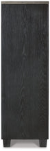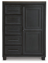 This door chest is casual contemporary style simply done right. Its two-tone color scheme features a rich brushed black main color accented with a beautiful dusty grayish brown wood tone. And there's plenty of storage to accommodate your wardrobe needs with ease. The dresser has 5 soft-close drawers, and behind the door you'll find pull-out trays for shoes or other accessories, along with shelving for bulky items.