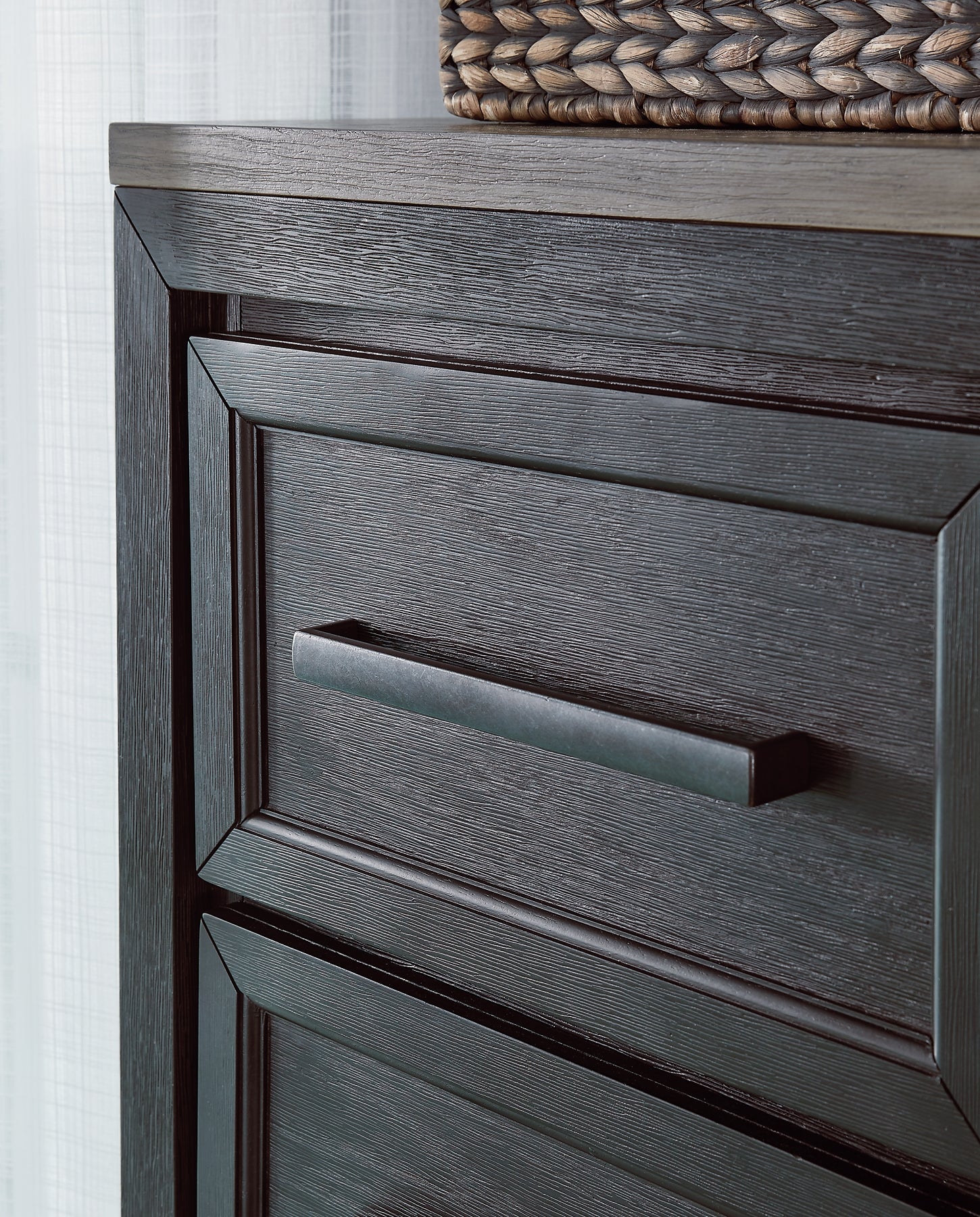 Made with hardwood solids, select oak veneers and engineered wood, Two-tone finish (brushed black and dusty grayish brown wood tone), Sleek drawer pulls with black finish, 5 soft-close, smooth-gliding drawers with fully finished interiors and dovetail construction (top drawers felt lined), 3 pull-out trays (felt lined) and 2 adjustable shelves behind door |