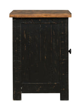 Made with pine veneers, pine wood and engineered wood, Two-tone distressed finish (light brown top and rustic vintage black base), Single door cabinet with metal grill and hardware, Center shelf |