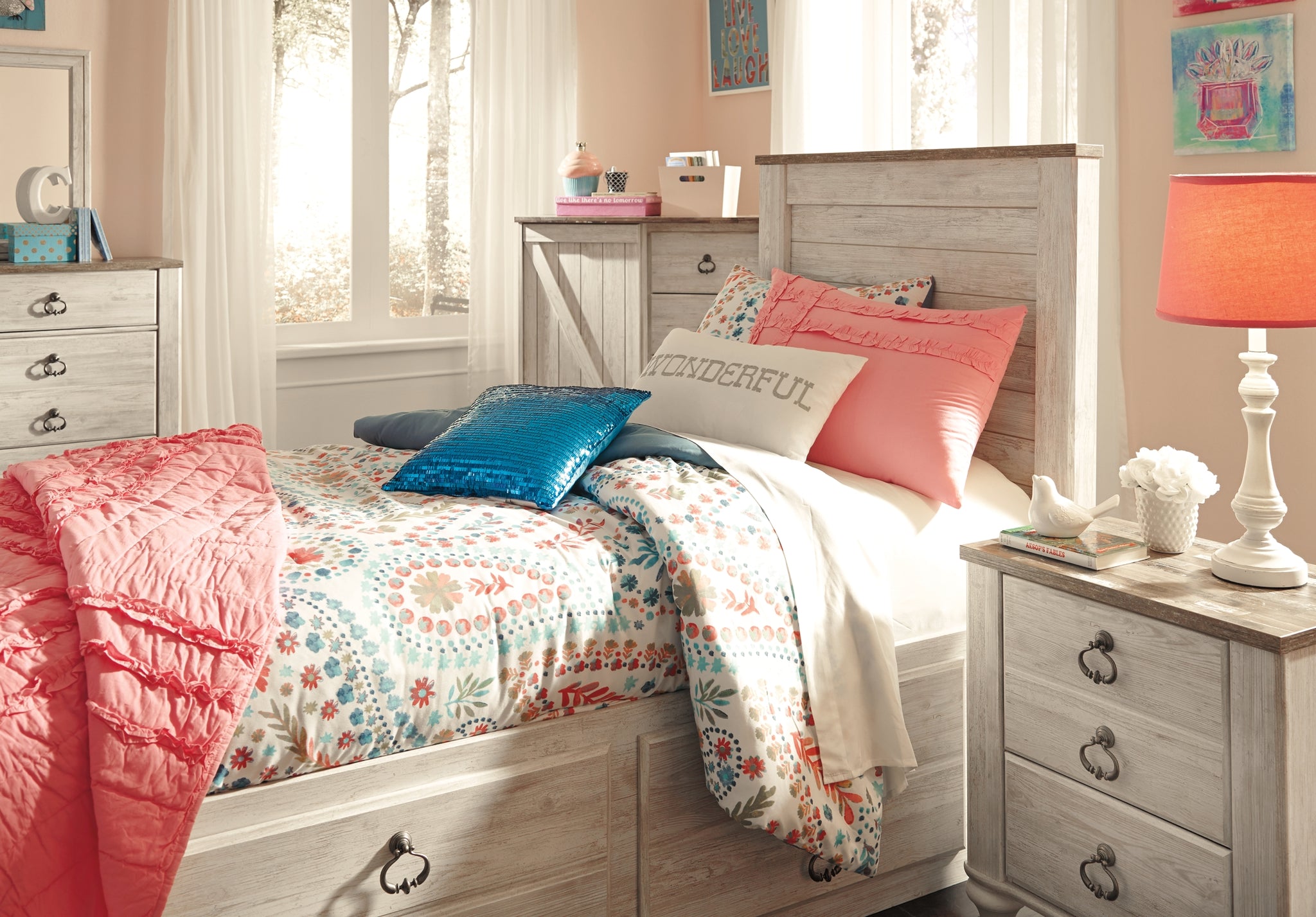 Includes headboard, footboard, rails and roll slats, Made of engineered wood (MDF/particleboard) and decorative laminate, Whitewash replicated worn through paint with authentic touch, Replicated wood grained block pattern with authentic touch, Antiqued brass-tone ring-pull hardware, Footboard with 2 smooth-operating drawers, Bed does not require additional foundation/box spring; accommodates most zero clearance adjustable bases with the addition of a bunkie board, Mattresses available, sold separately, Assembly required |